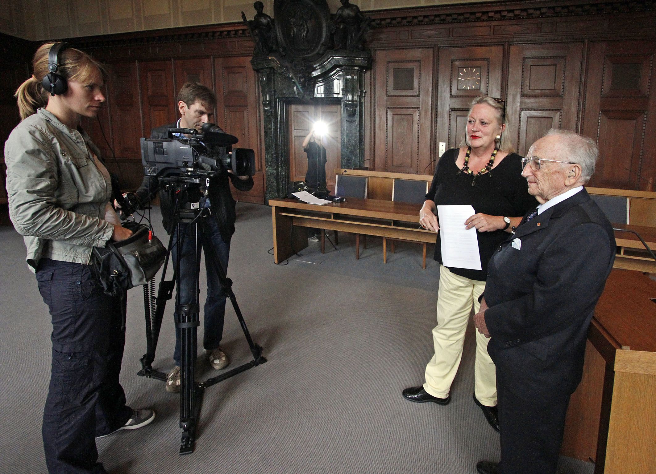 Ben Ferencz (rechts) beim Dreh mit Ullabritt Horn und Kameramann Hans Batz (hinten) im Gerichtssaal. Foto: Günter Distler/ Nürnberger Nachrichten.