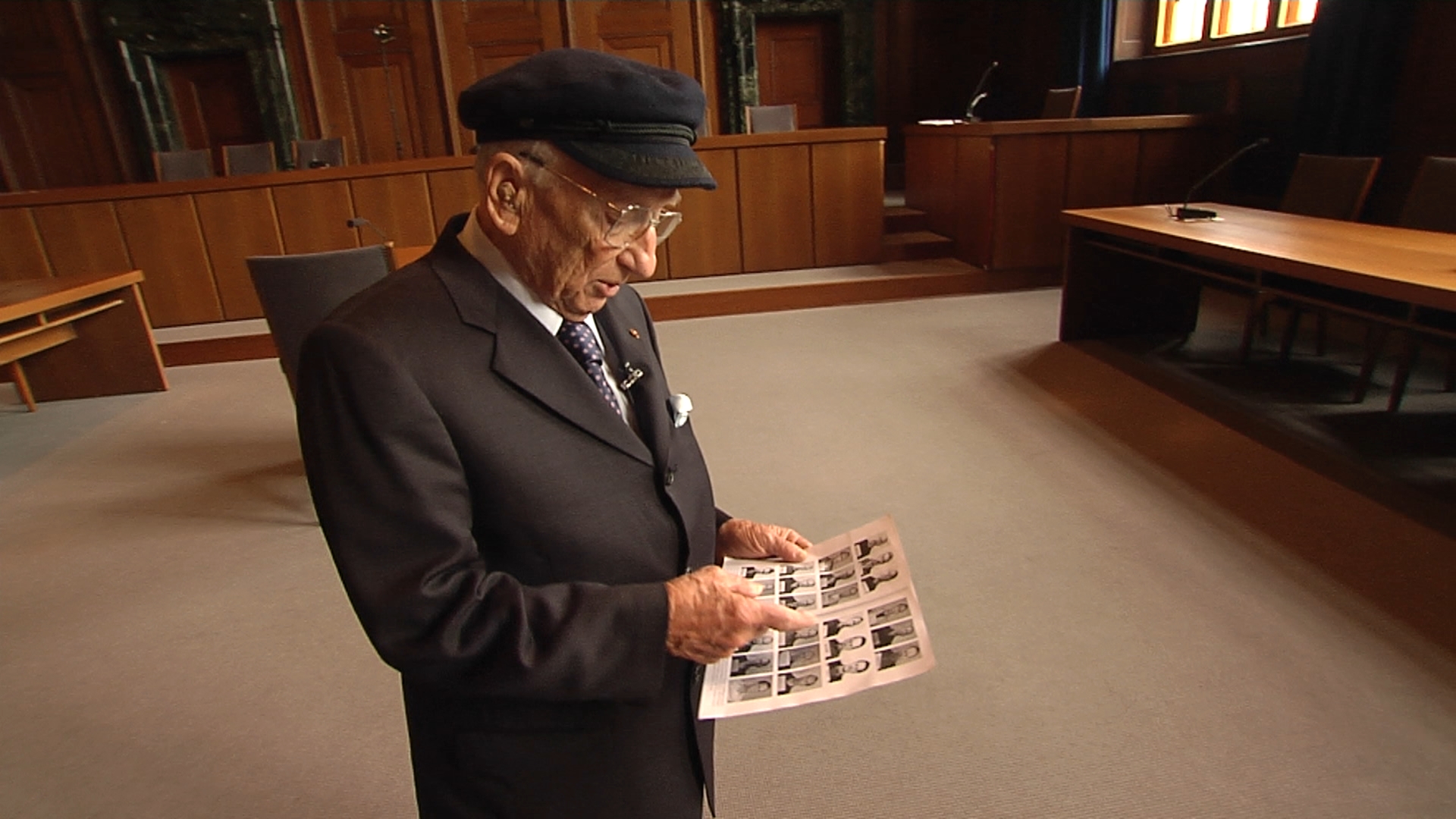 Ben Ferencz im Gerichtssaal 600 mit den Fotos der angeklagten NS-Verbrecher. -