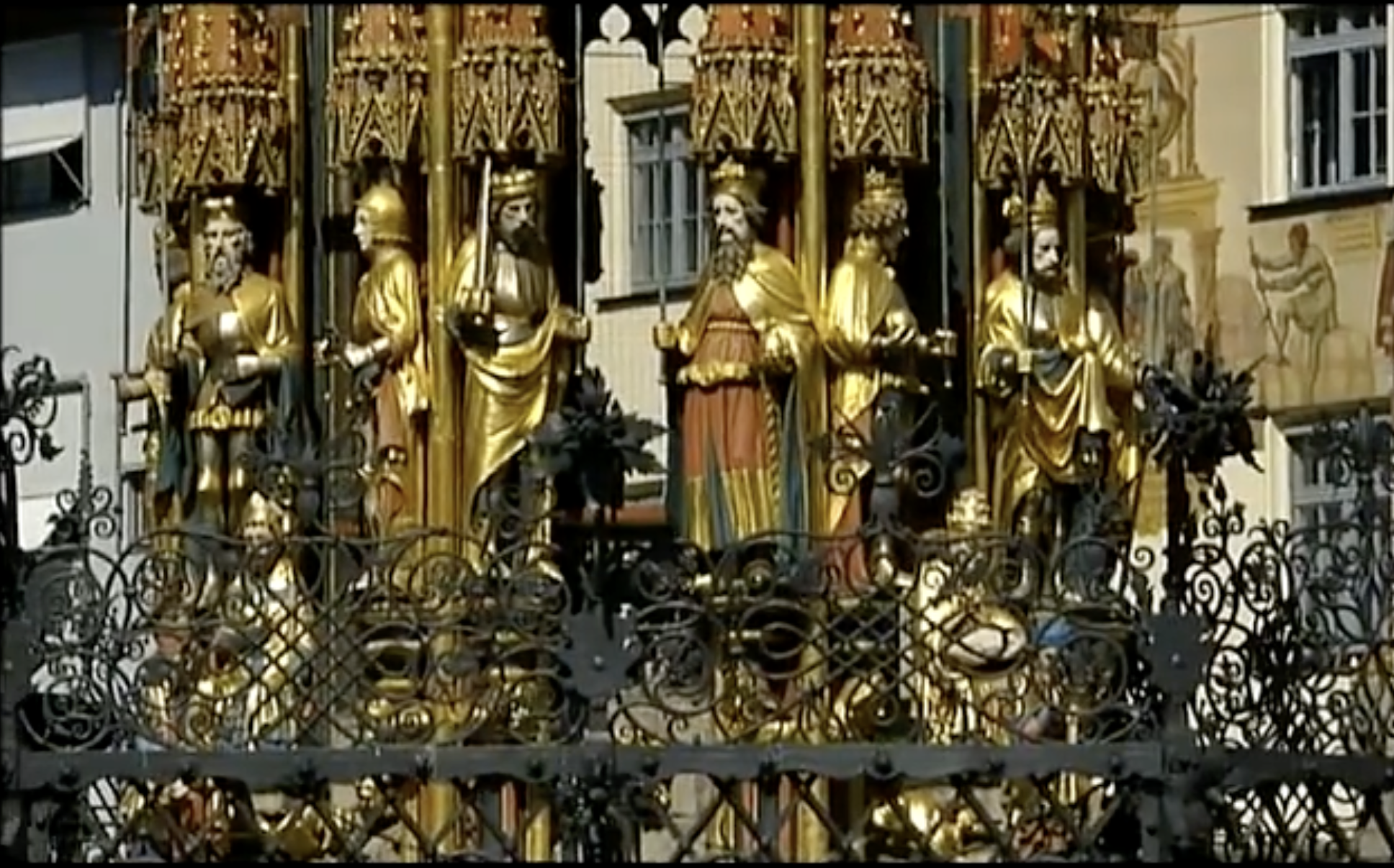 Der Schöne Brunnen in Nürnberg mit seinen historischen Figuren, noch unverstellt. -